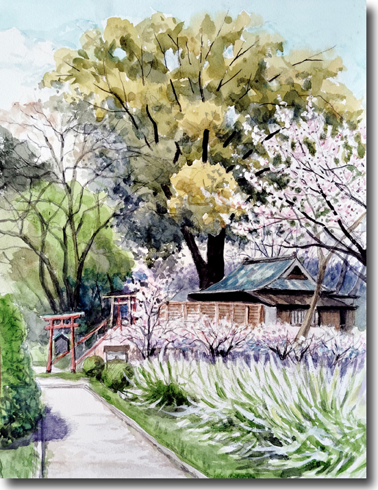 今年は 池のそばにあるお宮さんを中心に桜、楠と雪柳を描くことにした。