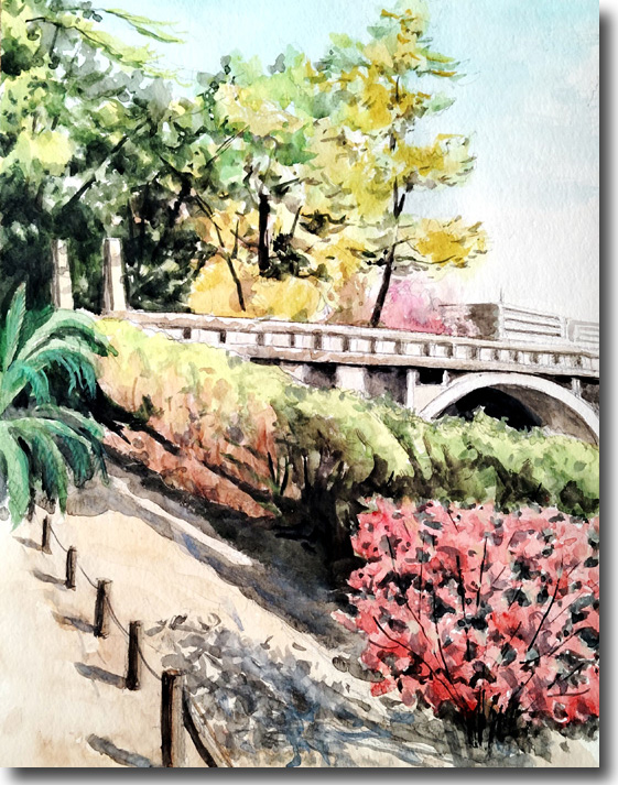 橋の欄干から遠目に描いて見た。 |