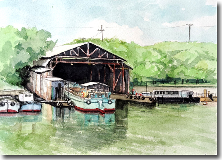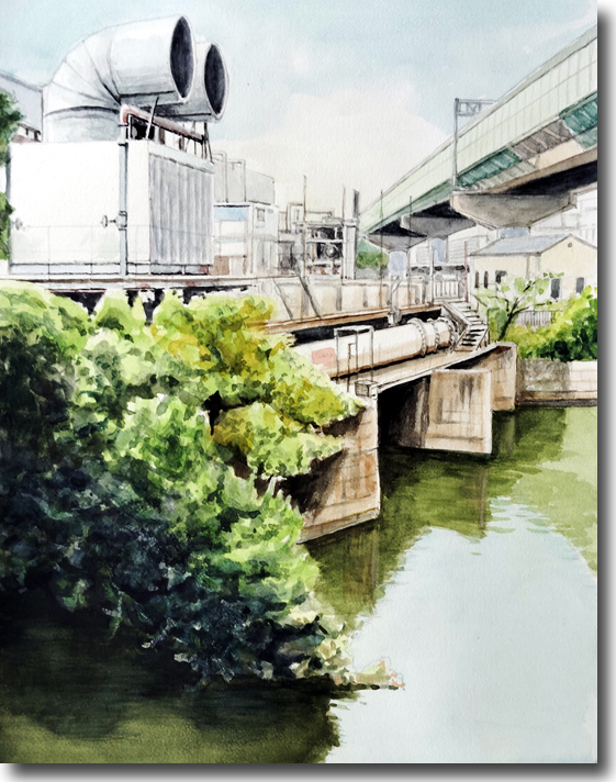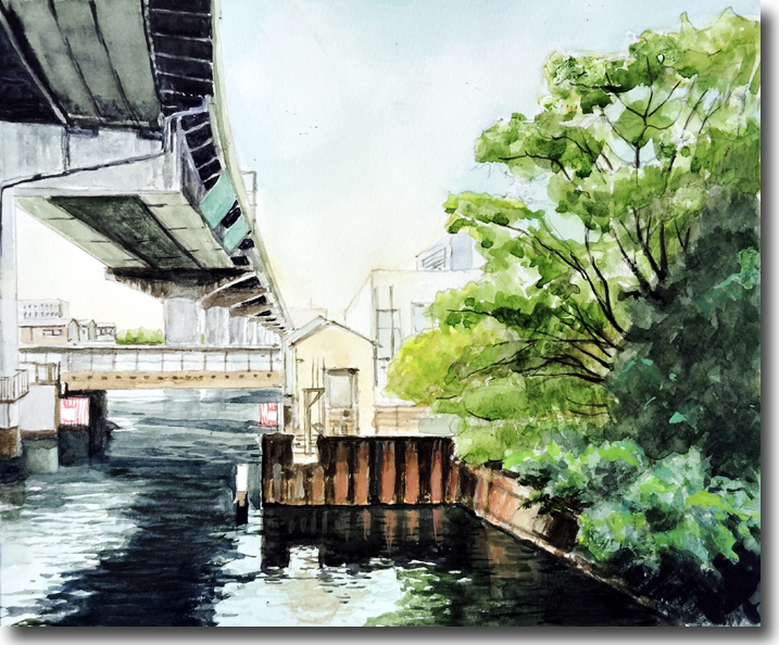 | 仲間と久しぶりに大川の毛馬あたりに出向く。 高速道路の真下が日陰になって風も心地よい。 まずは対岸の小さなドックを描く。以前も描いたが 何回描いても難しいモチーフだ。 |