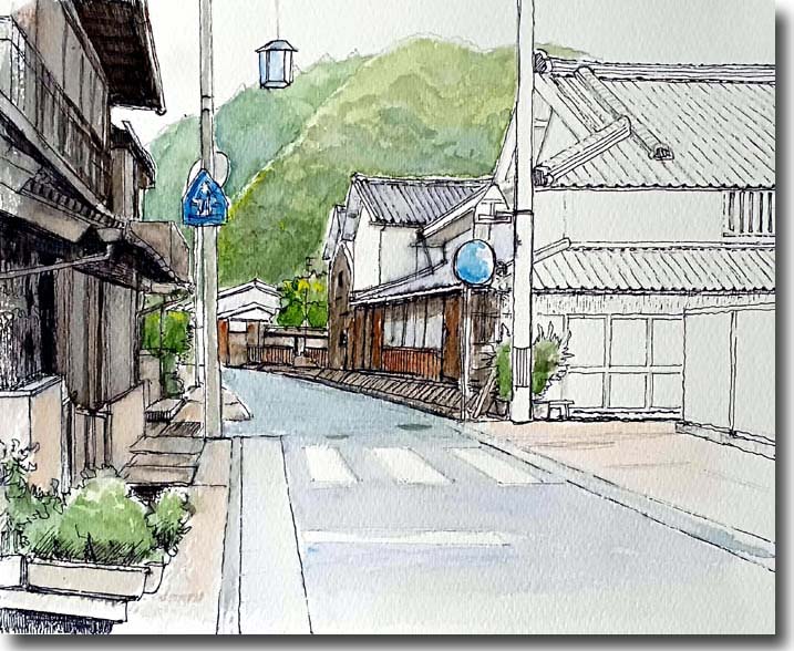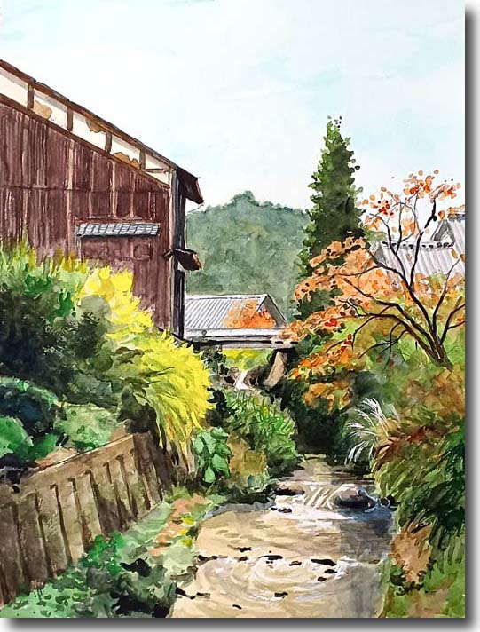 旧街道に沿って 川が流れているが、大きくなくて描きやすい。