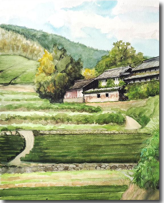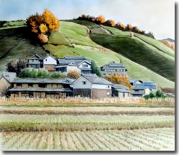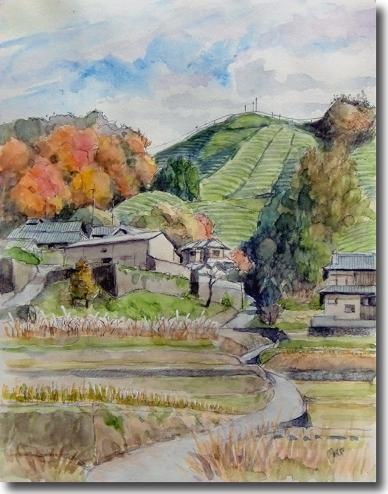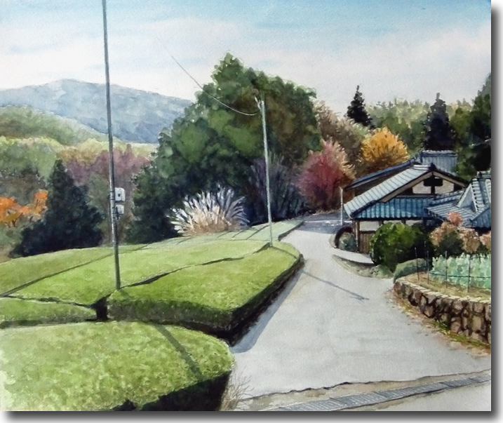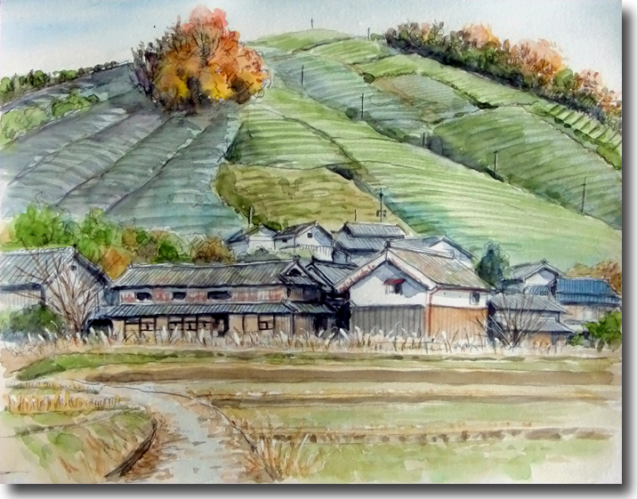 10月の茶畑(その1、白壁の旧家) (水彩 F6 2025-10) |