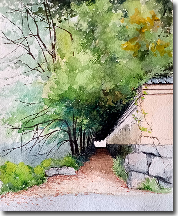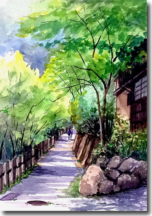 土塀と新緑に包まれたこの小径は、かねて描いてみたいと思っていた。 |