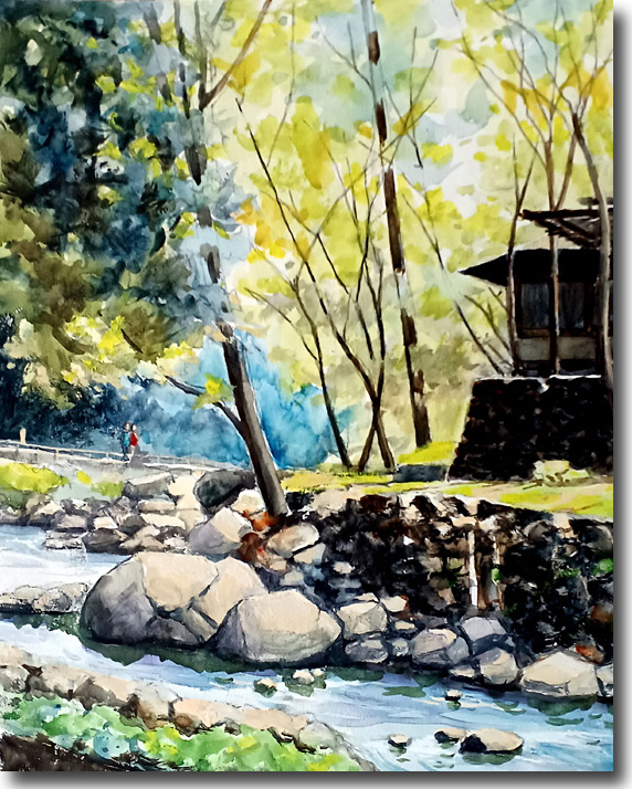 箕面渓谷(川辺木漏れ日) (水彩 F4 2024-10) |