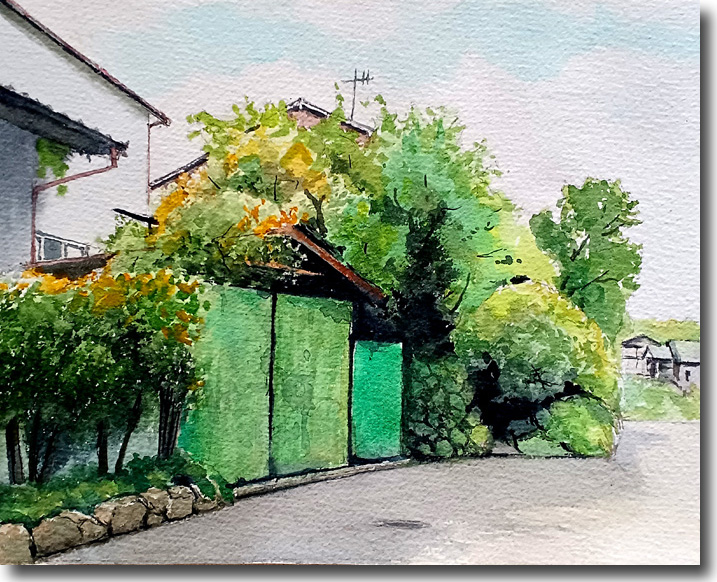 どこを描こうかと ぶらぶらしていると、新緑に囲まれた緑のガレージがあった。