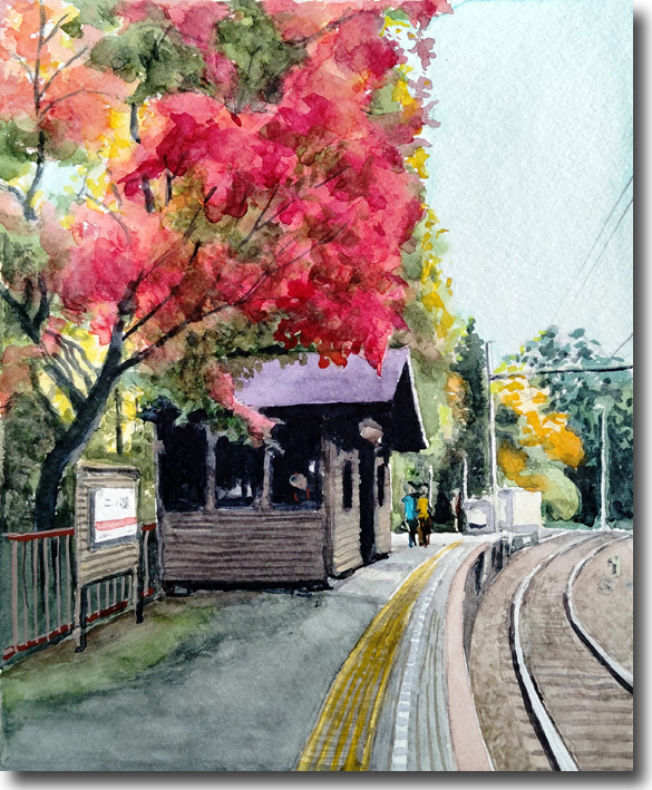 二の瀬紅葉(その11、駅も紅葉) (水彩 F4 2025-11) |