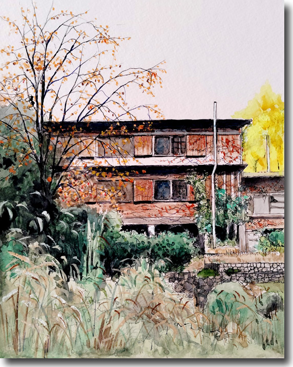 二の瀬紅葉(その7、廃屋秋景) (水彩 F4 2025-11) |