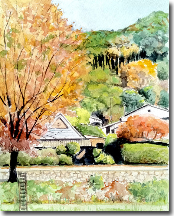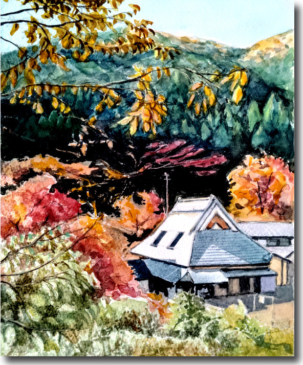 二の瀬紅葉(その5、農家紅葉) (水彩 F4 2025-11) |