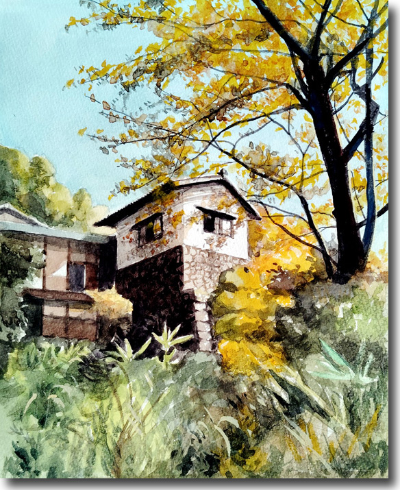 二の瀬紅葉(その9、旧家の辺り秋景) (水彩 F4 2025-11) |