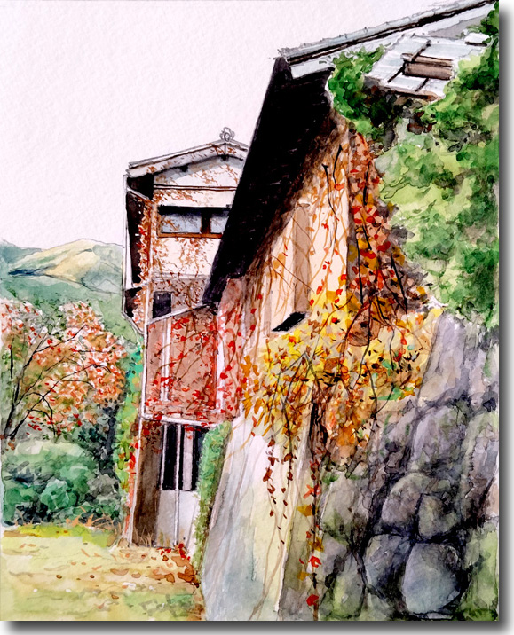 二の瀬紅葉(その8、廃屋つたも紅葉) (水彩 F4 2025-11) |